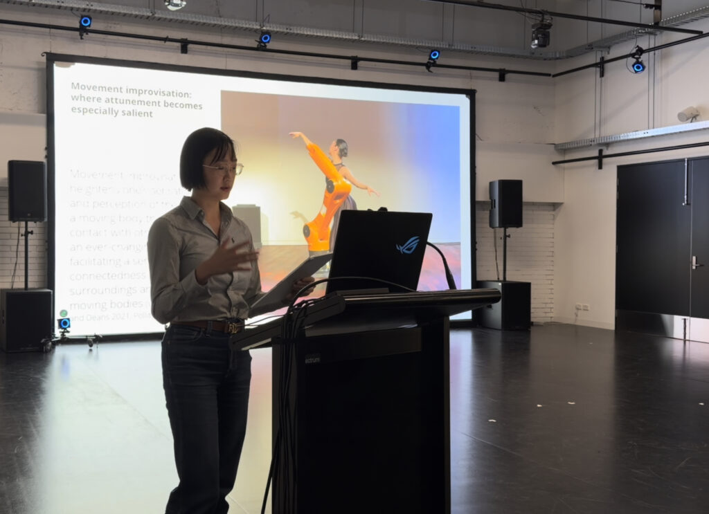 During the exchange, I made great connections with the centre’s researchers, where we had in-depth conversations about our research interests. We talked about potential collaborations and sharing outputs where we can. Through their network, I was able to connect with some researchers at the University of Melbourne who share similar interests in robotics and artistic approaches. I participated in various research activities, including a presentation at a symposium about creative technologies, robot movement investigation, two short interviews, and providing dance data for the centre’s motion capture system, which will later be mapped onto a humanoid robot. While I cannot provide all of these valuable experiences in detail, I present below two activities that were especially memorable.