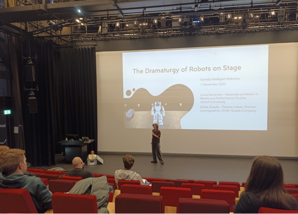 On December 1st, 2025, Dr. Laura Karreman—Associate Professor in Media and Performance Studies at Utrecht University (UU)—and Ulrike Quade—theater director, artistic researcher, puppeteer, and scenographer—gave a lecture at the Vrije Universiteit Amsterdam (VU) titled The Dramaturgy of Robots on Stage. The lecture was presented in the context of the collaborative exchange project between the courses Socially Intelligent Robotics (VU) and Expanding Performance (UU). At the end of this collaboration—part of the larger research project Dramaturgy for Devices—VU students had to design and develop a performance with NAO robots, drawing on the dramaturgical advice provided by UU students.