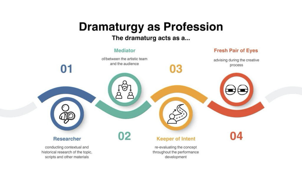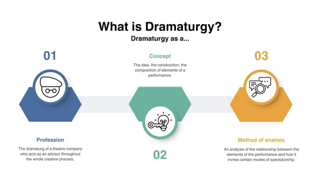 As discussed by Laura, dramaturgy can take on three different meanings: a profession, a concept, and a method of analysis. As a profession, it refers to the profession of the dramaturg, who acts as an advisor throughout the whole creative process. This includes conducting the preliminary research, guiding and making choices during the creation of the script and the overall performance, and mediating between the play and the audience. The dramaturg supervises the performance from its inception to its final form, making sure that it is coherent in its intended aim and making adjustments if necessary. In the second sense, dramaturgy refers to the performance’s underlying idea, the different elements that contribute to conveying its message. In the third sense, dramaturgy refers to a type of analysis that looks at how the construction of the performance works in practice, taking into consideration the relationship between its elements and the modes of spectatorship it invites.