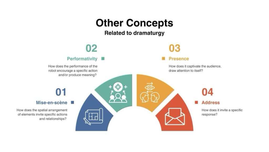 The lecture aimed to equip students with concepts, tools, and practical examples from theater to further develop their performances and was divided into two parts. In the first, Laura introduced the core concept of dramaturgy alongside the four related notions of performativity, mise-en-scène, presence, and address (Bleeker and Rozendaal 2021) and concluded with examples of theater performances in which robots take on the role of main performers. In the second part, Ulrike offered additional insights into how to work with robots on stage by discussing some of her most recent works and showcasing how puppeteering can help develop robotic performances through a practical demonstration.