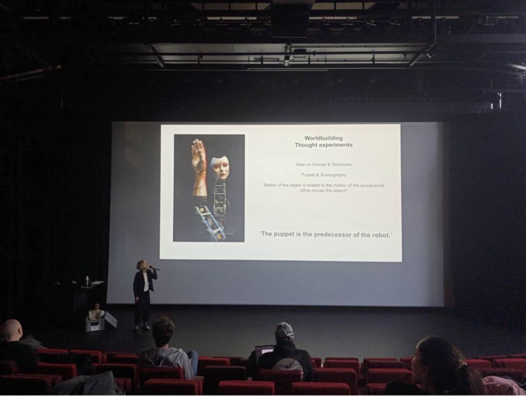 As Ulrike Quade explained during the second part of the lecture, her practice is always oriented toward worldbuilding and thought experiments, and her most recent work makes extensive use of robots on stage. Whether working with a robot, a puppet, or a human, she approaches her characters in terms of relationality, focusing on how they are connected to each other and their surroundings. She discussed examples from her practice while expanding on the concepts presented by Laura. In Spot x Kafka (2024)—a theatrical exploration of humanity, technology, and their entanglement—central are the themes of identity and transformation. By conceiving the robotic performance as a process of becoming and by playing with different scales—alternating a full-size Spot robot and a miniature version of it—she invites the audience to look at and relate to the robot differently depending on its relationship with the human actor and the surrounding spatial composition. She then turned to Rocky the Robot (2022) to expand on the concept of mise-en-scène. The plot is about a robot that falls in love with a flower and on stage humans, robots, and objects co-create meaning through multiple perspectives. The audience is invited to adopt the points of view that populate this hybrid world, inviting their attention to move between different elements.