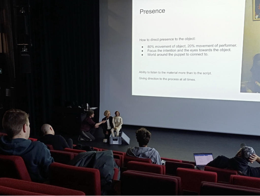 A central point made by Ulrike is that the puppet is the predecessor of the robot and that a deeper understanding of how to work with robots on stage might be gained by returning to their ancestors. Through a short demonstration, Ulrike exemplified how techniques borrowed from puppeteering might be used to direct presence and shape address. Drawing from her research and experience with Bunraku theater, she showed how, when the performer is on stage with a puppet, 80% of the attention is focused on the puppet, while 20% is focused on the performer. The advice she gave to the VU students was to believe in the liveness of the puppet and to focus one’s eyes on its actions. Indeed, when a performer focuses their attention on what the puppet is doing, the audience’s attention follows, increasing the illusion that it is moved by a need, an urgency, and an intention.
